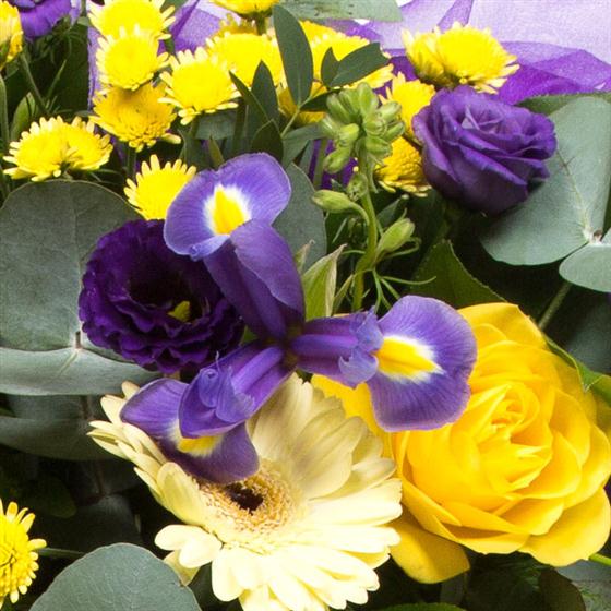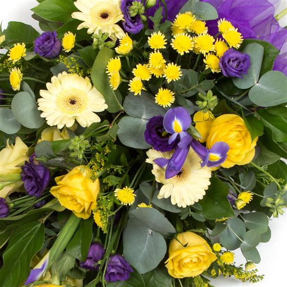 A colourful tribute of seasonal blooms in shades of purple and lilac with contrasting golds and lemons.
